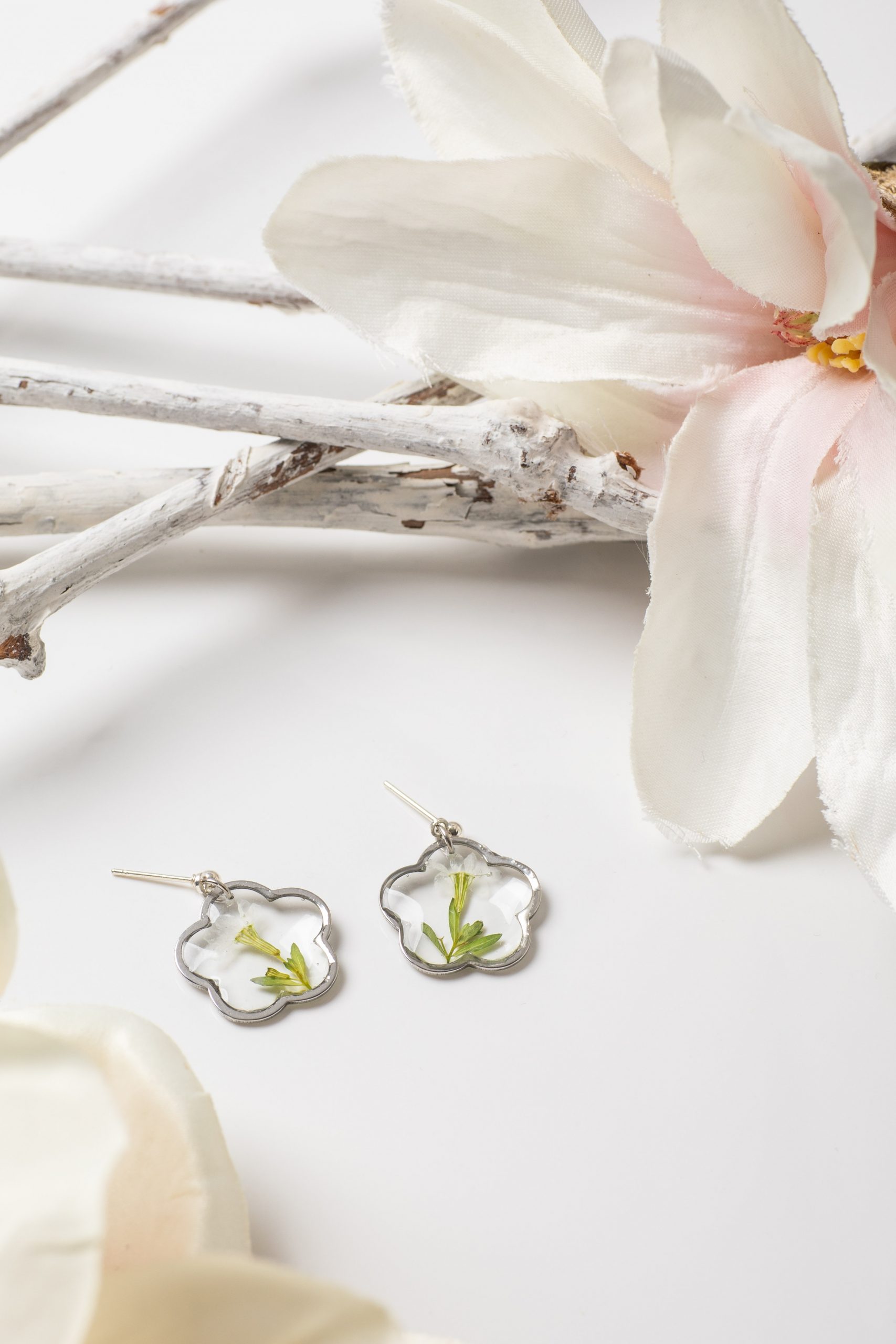 Ohrstecker Hänger Resin Schleiermyrte Silber Blume weiß